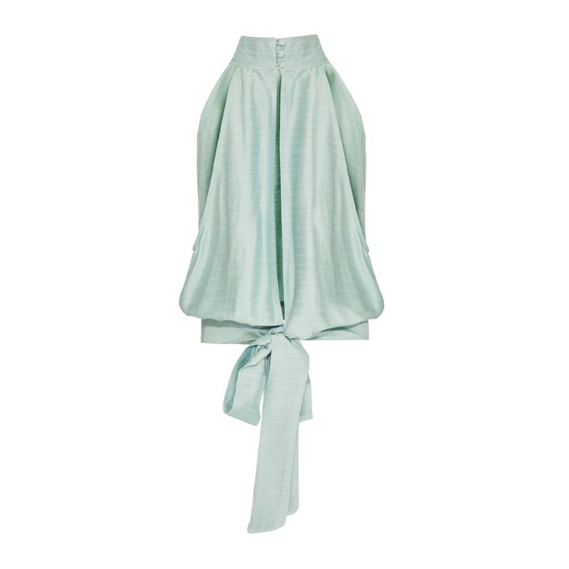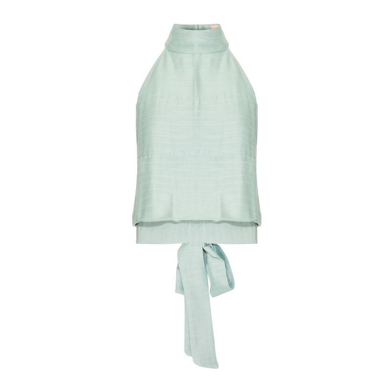 Tem caimento fluido, toque suave e brilho sutil que valoriza a peça. A modelagem com gola alta e amarração nas costas traz sofisticação e destaque para as costas, equilibrando sensualidade e delicadeza.
