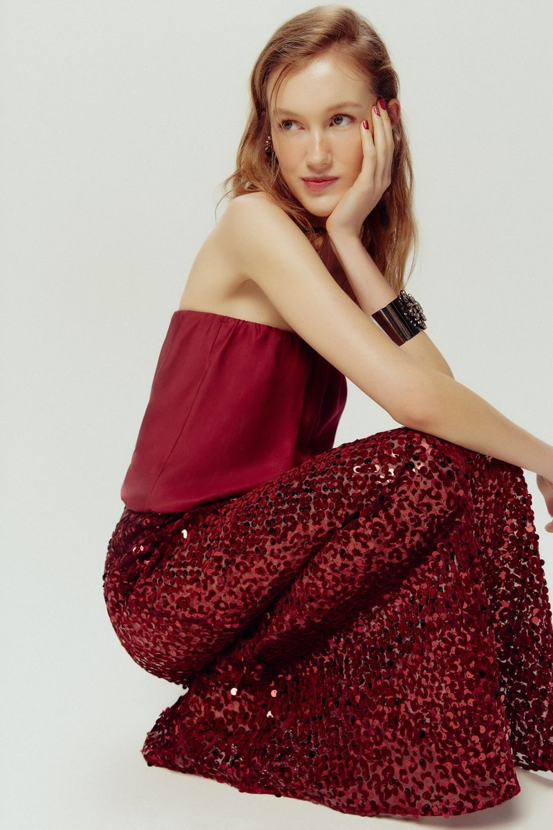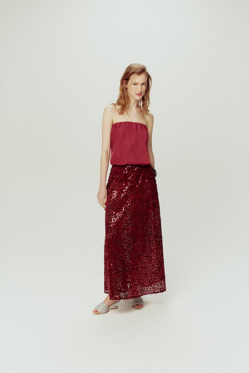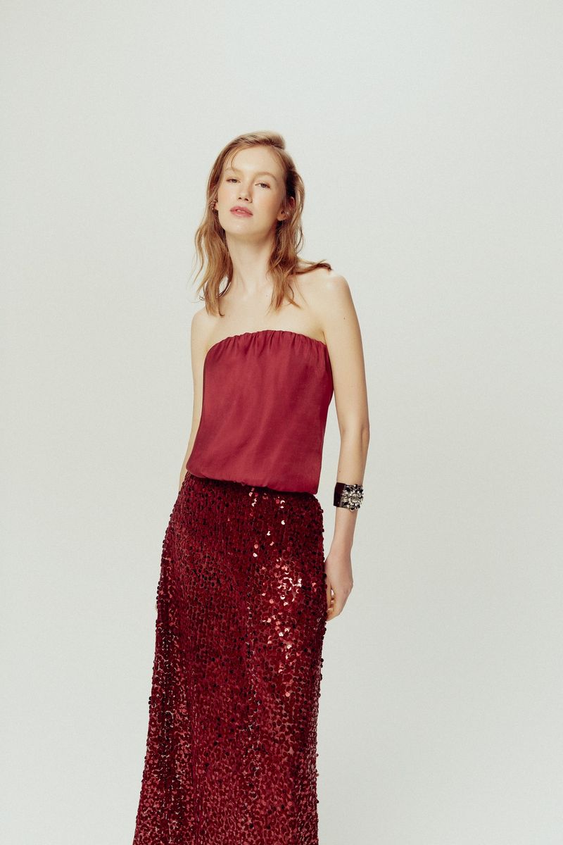 Body Reto Bordô é um modelo tomara que caia, confeccionado com blouse de tecido plano em viscose que possui um leve brilho e traz movimento e jovialidade para a peça. O body é forrado por uma malha dupla de poliamida com elastano, e possui na parte interna um top para sustentação dos seios. Essa peça possui elastico no decote e cintura, para auxiliar na vestibilidade.