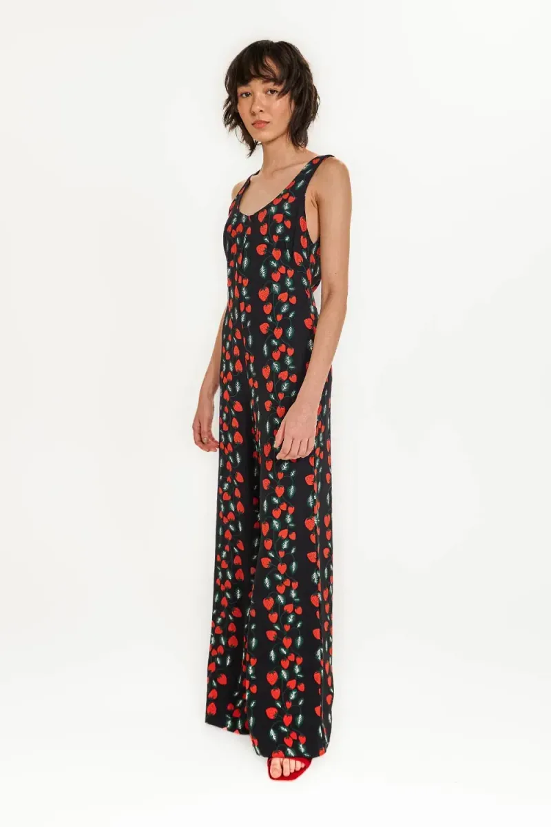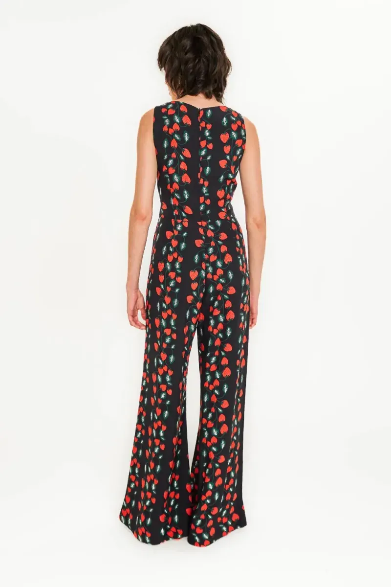 Macacão em tecido leve e estampado com fundo na cor preta, fechamento em ziper invisivel nas costas, decote em V, shape fluido, alças medías.