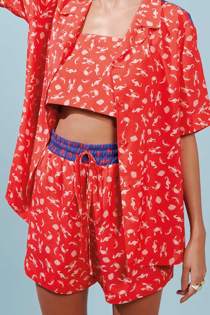 Short com cós de elástico, bolso lateral e shape soltinho. Mix de estampa de crustáceos vermelho e azul. Crepe com peso médio e ótimo caimento 100% viscose