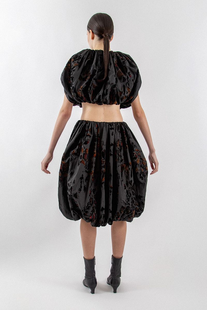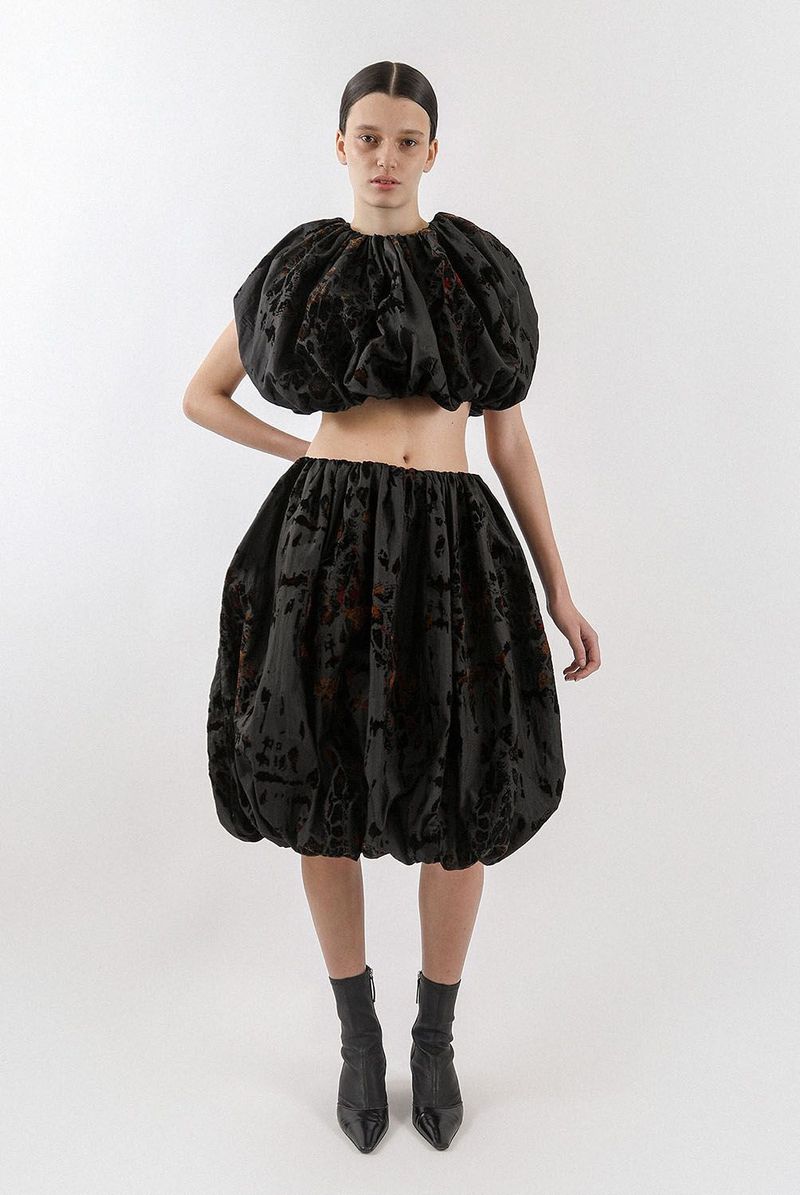 Blusa cropped com modelagem justa ao corpo em tecido duplo da linha Re-ÃO com aplicação de tecido balonê com efeito drapeado, formato amplo extra-corpo e fechamento por zíper destacável nas costas.