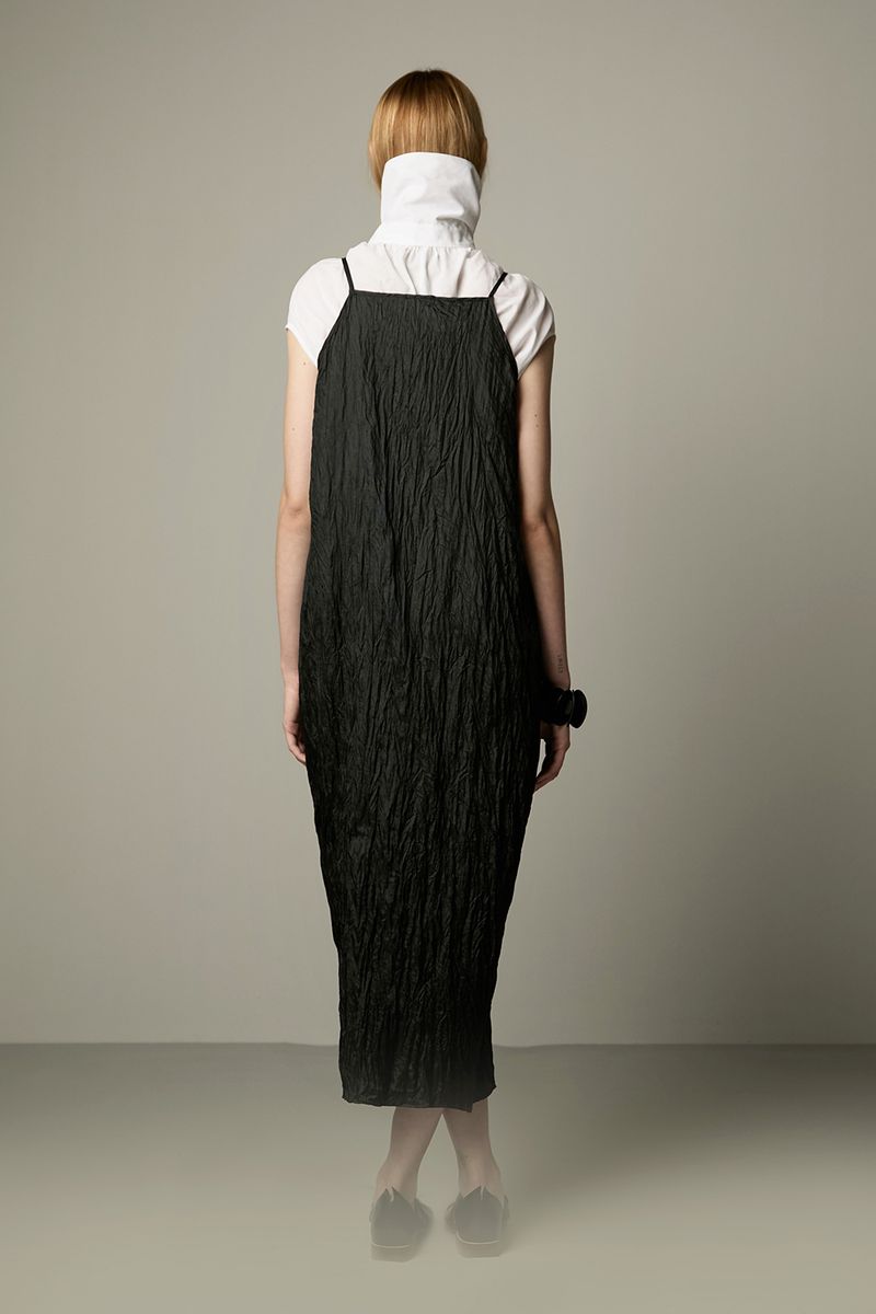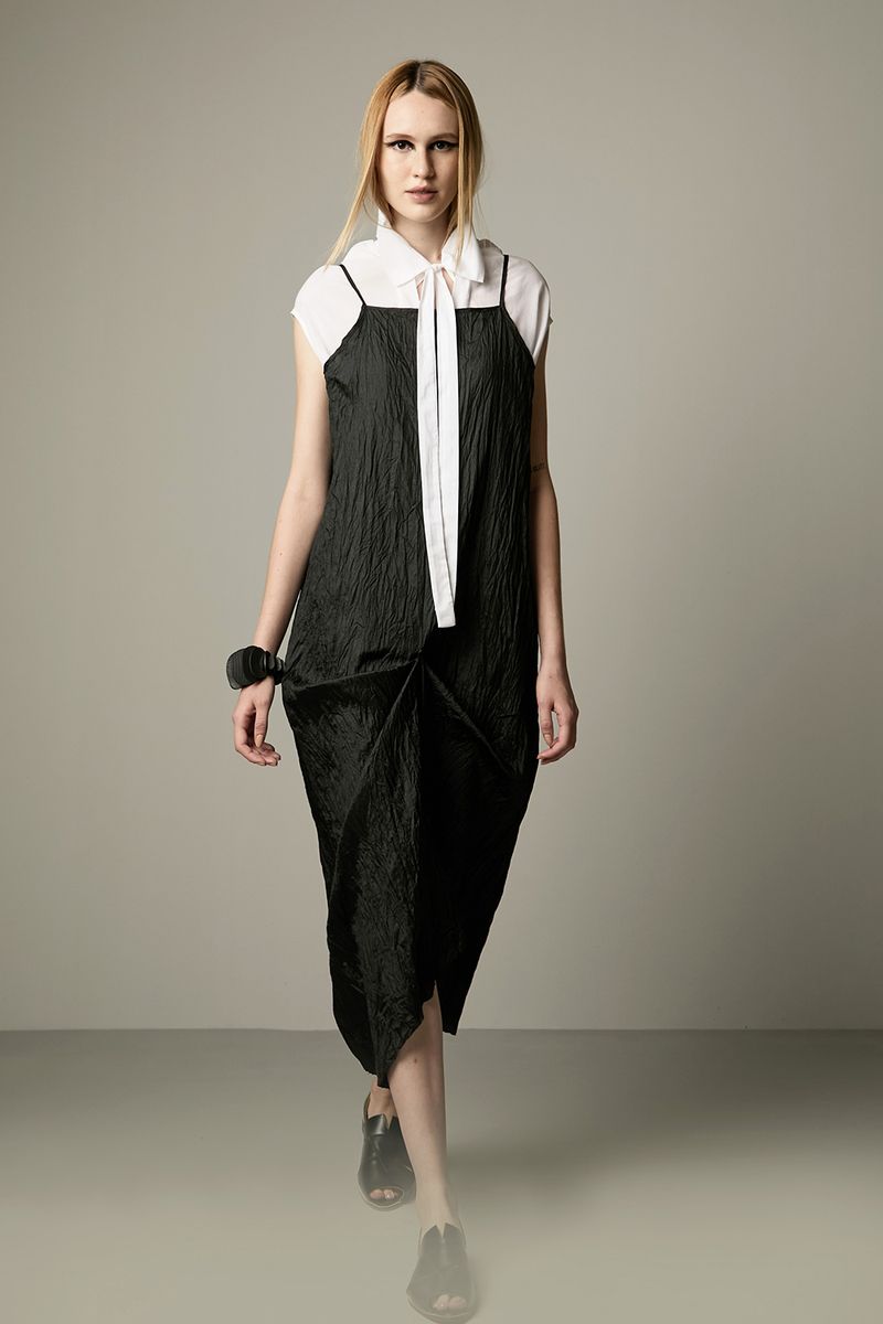 Vestido reto levíssimo em tecido tecnológico preto com decote reto e alças de viês. Botãozinho recoberto na saia para deixá-lo com movimento e comprimento mais curto na frente.