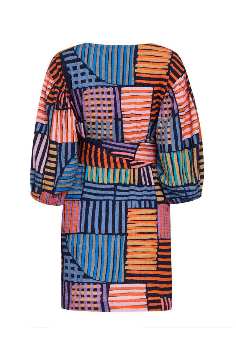 Inspirado nas obras vibrantes de Sonia Delaunay, este vestido curto é uma peça que une arte e moda. A estampa exclusiva traz formas geométricas dinâmicas e cores expressivas, criando um visual moderno e autêntico. O design valoriza a silhueta com um cinto ajustável na cintura, enquanto as mangas bufantes adicionam um toque sofisticado e elegante. A abertura com zíper no decote traz um detalhe funcional e estiloso. Perfeito para quem busca um look marcante, cheio de personalidade e atitude.