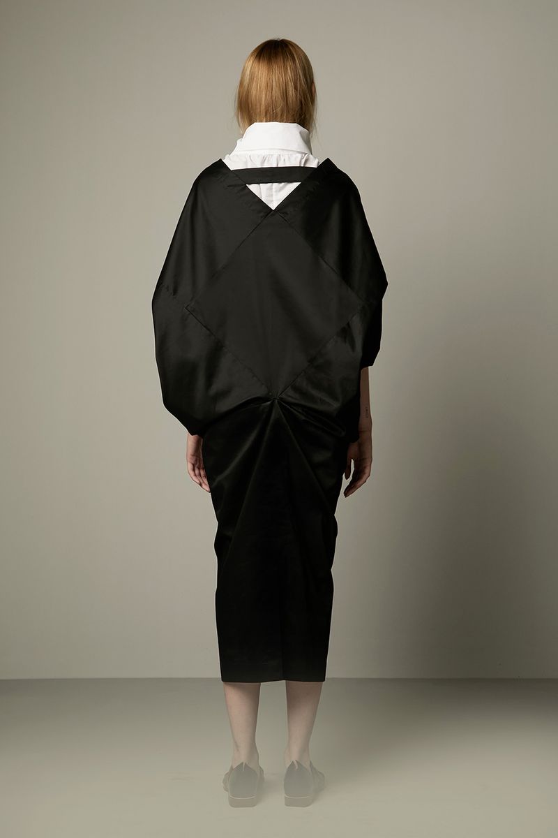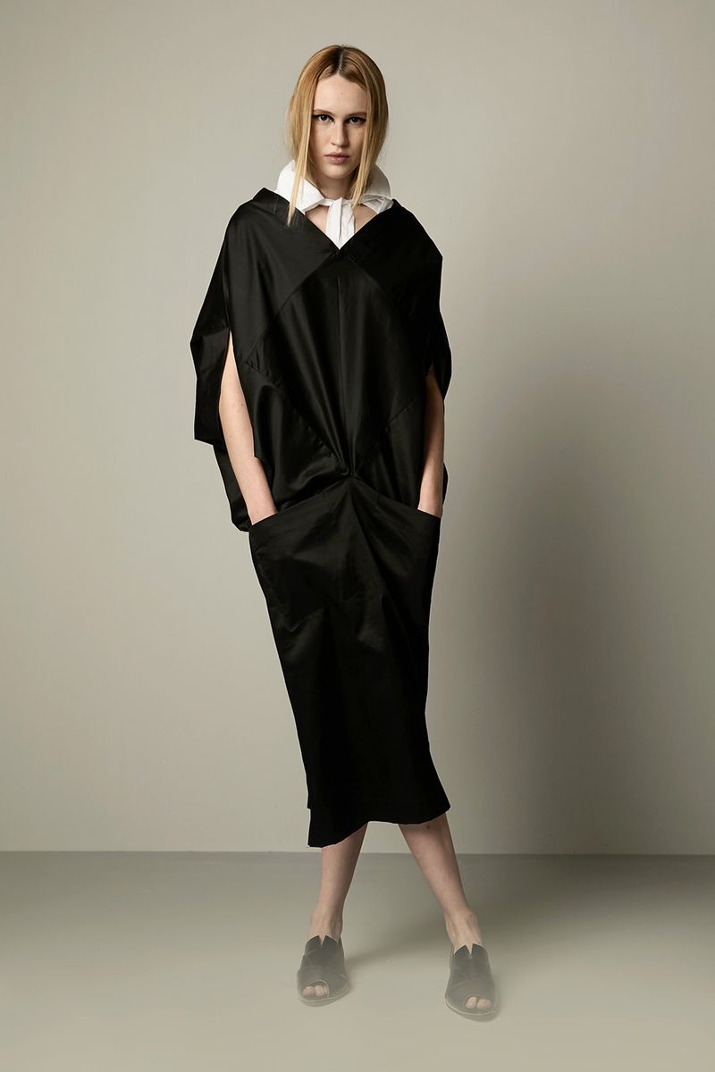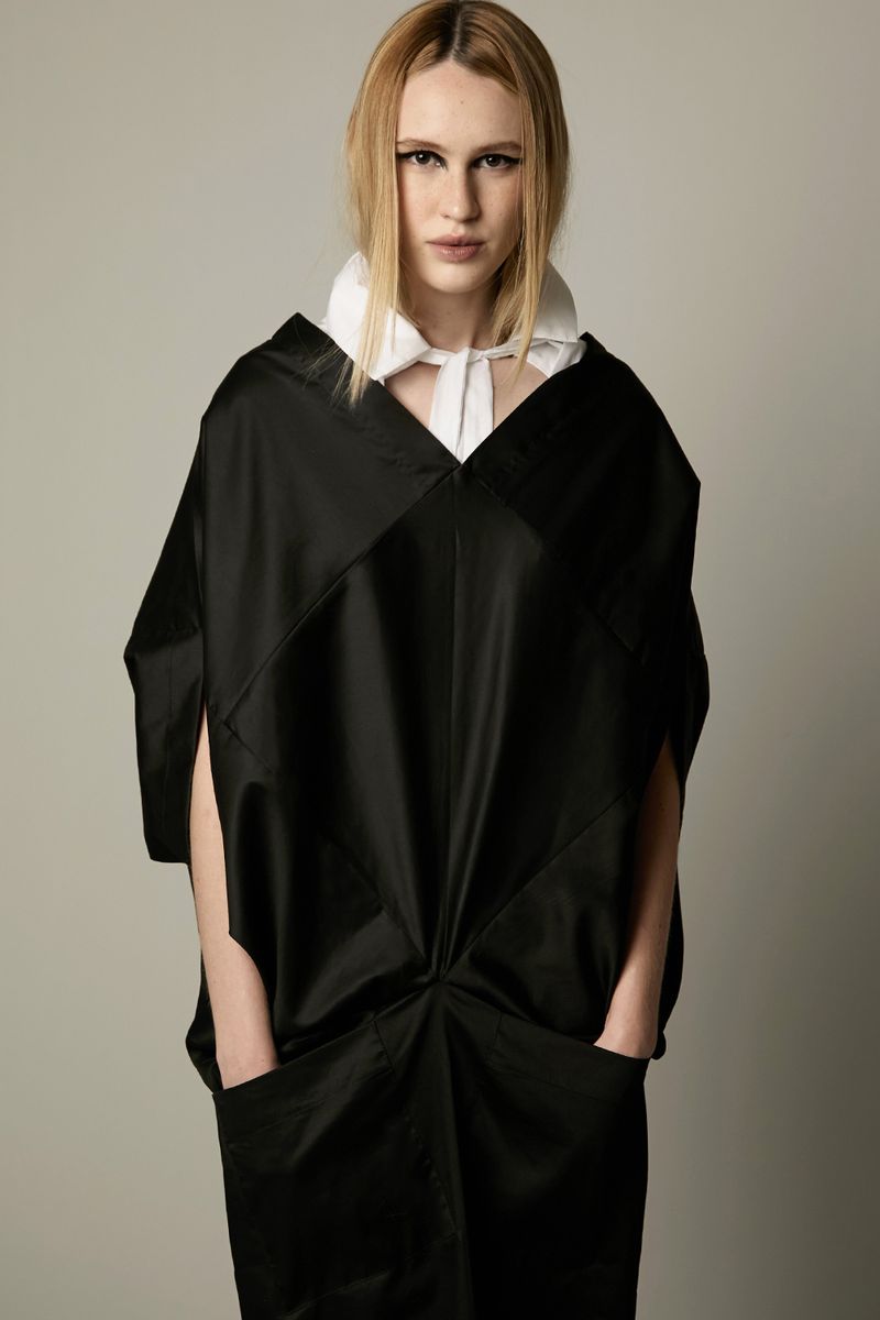 Vestido origami preto midi, com recortes geométricos e bolsos na frente. Estilo japonês..