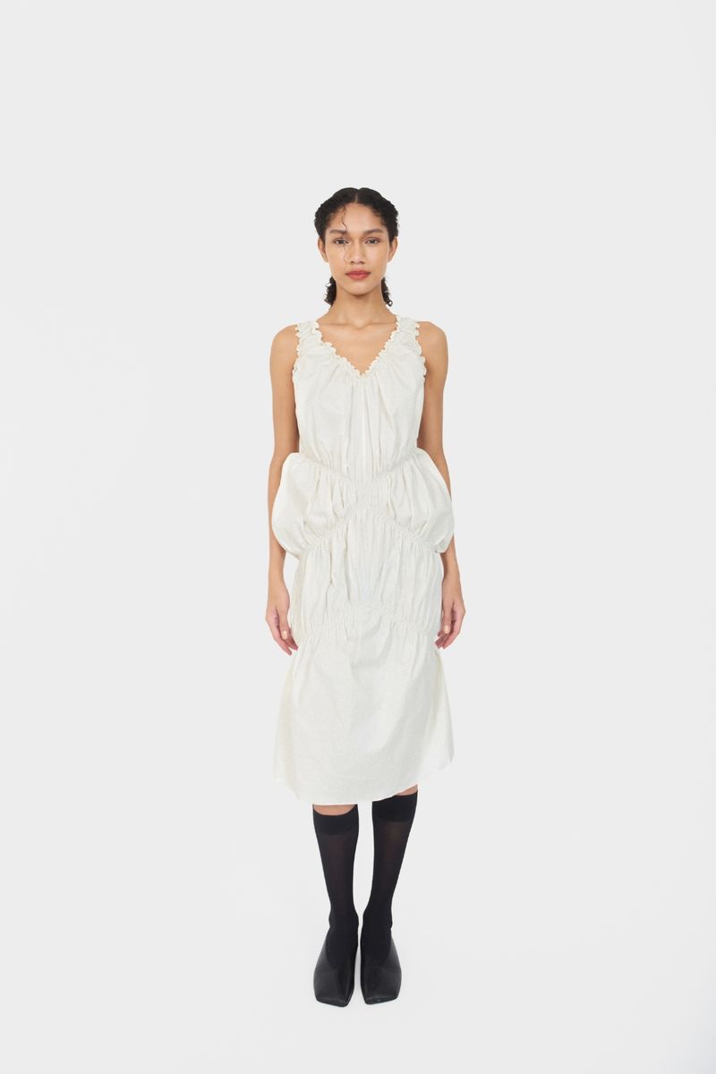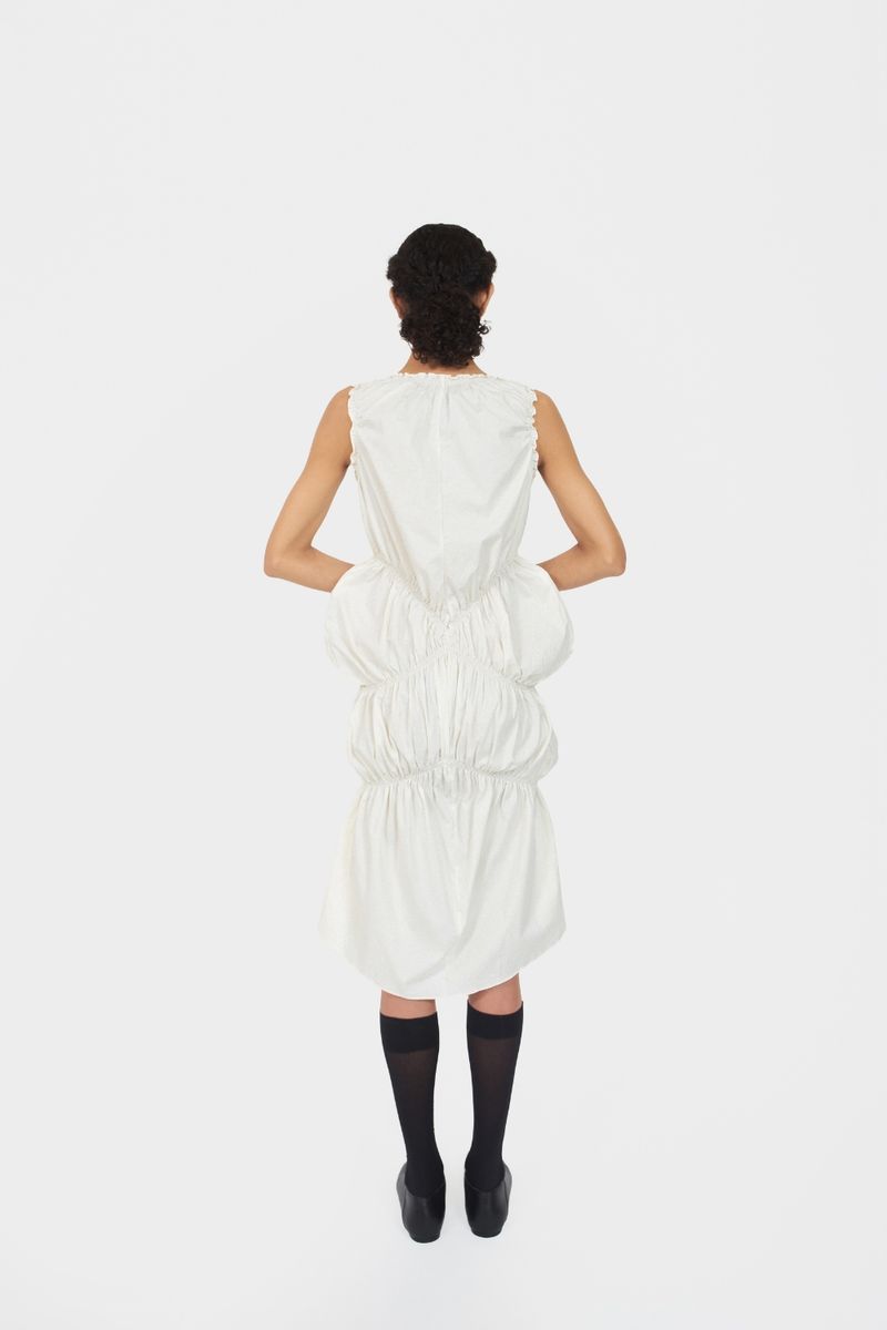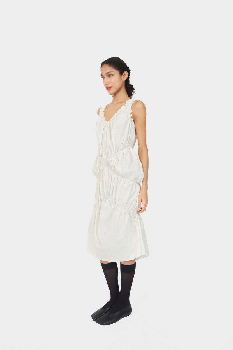 Vestido com modelagem ampla. Altura midi. Aplicação de linhas elásticas em V ao longo do vestido, decote V e acabamentos em barra de lenço.