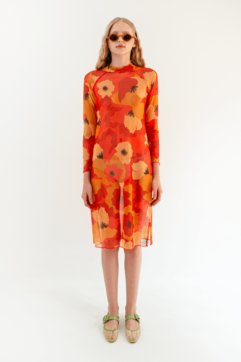 Vestido em tule com estampa floral em tons quentes de laranja.